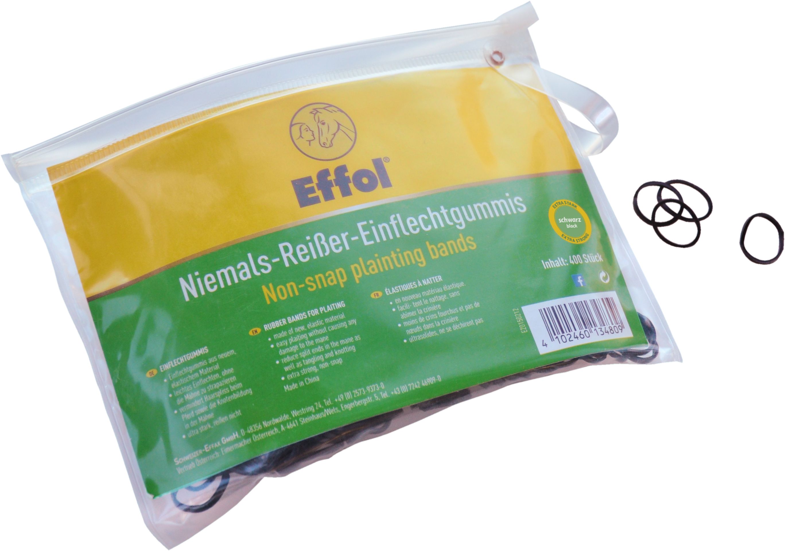 Die Effol Niemals-Reißer-Einflechtgummis sind speziell entwickelte Einflechtgummis, die aus einem extra elastischen Material bestehen. Sie sind ideal zum Einflechten der Mähne, da sie Haarspliss und Knotenbildung verhindern und somit die Mähne schonen. Diese Gummis ermöglichen ein leichtes und sicheres Einflechten, ohne die Mähne zu strapazieren, was sie zu einer ausgezeichneten Wahl für Pferdebesitzer macht, die besonderen Wert auf die Pflege und das Aussehen der Pferdemähne legen.