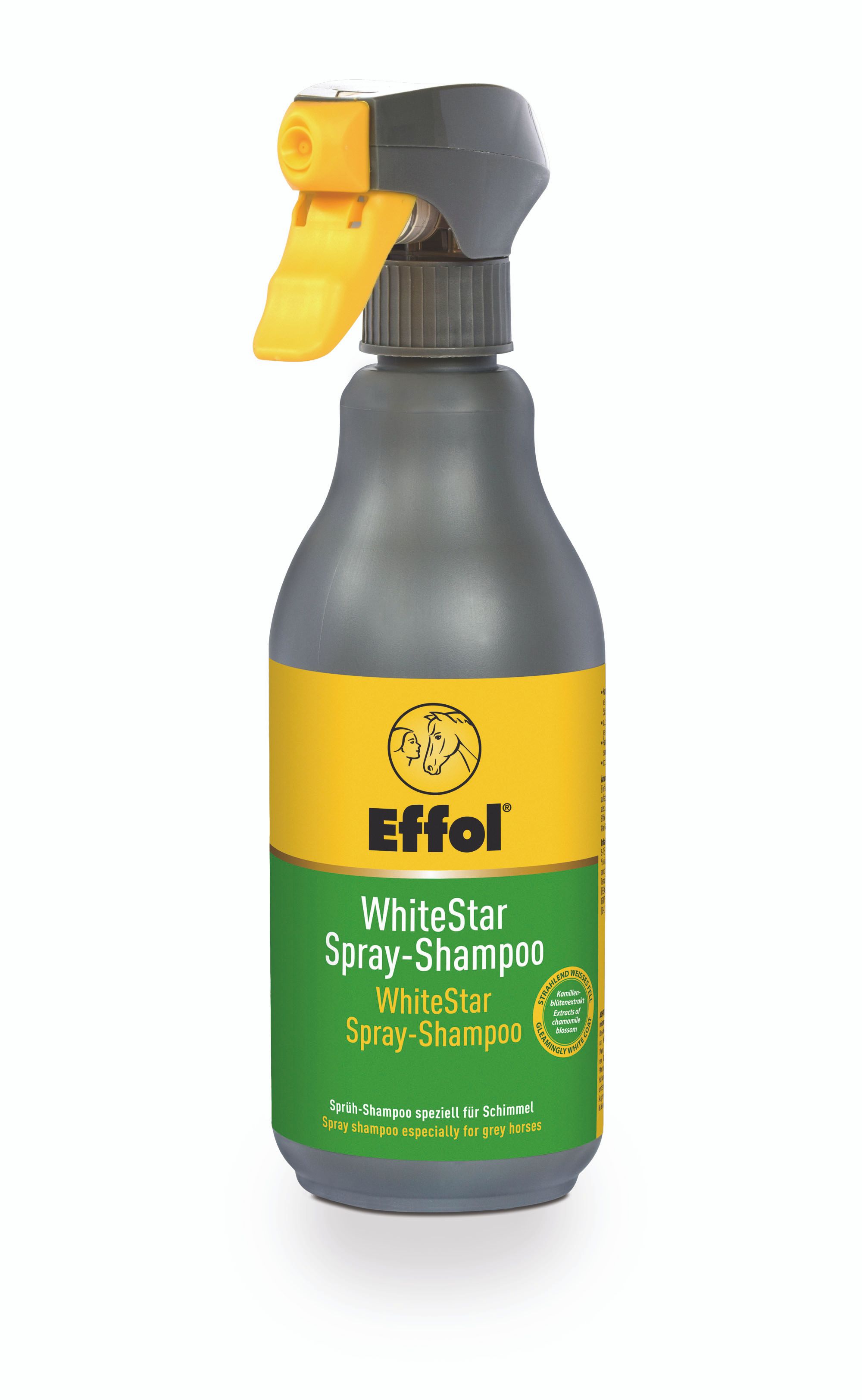 Das Effol White-Star Spray-Shampoo ist ein speziell entwickeltes Sprüh-Shampoo für weißes oder helles Fell, ideal für Schimmel und andere helle Pferde. Es entfernt selbst hartnäckigen Schmutz und neutralisiert Gelbstiche, wodurch das Fell strahlend rein und hell bleibt. Zusätzlich pflegt Panthenol die Haut und Kamillenblüten-Extrakt stärkt ihre Schutzfunktion. Das Shampoo ist einfach anzuwenden: Es wird auf das feuchte Fell gesprüht, eingerieben und anschließend mit Wasser abgespült.